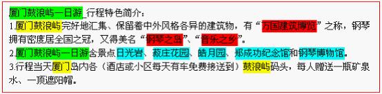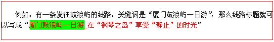 線路關鍵詞一定要出現在線路行程中——關鍵詞是以多種組合形式出現的:原詞完整出現(1-2次即可),分詞、同義詞、近義詞分散出現。整個線路行程內容字數要盡量在500字以上,自然寫作即可,合理地把關鍵詞融合進行程中,不必要刻意的去凸顯關鍵詞。